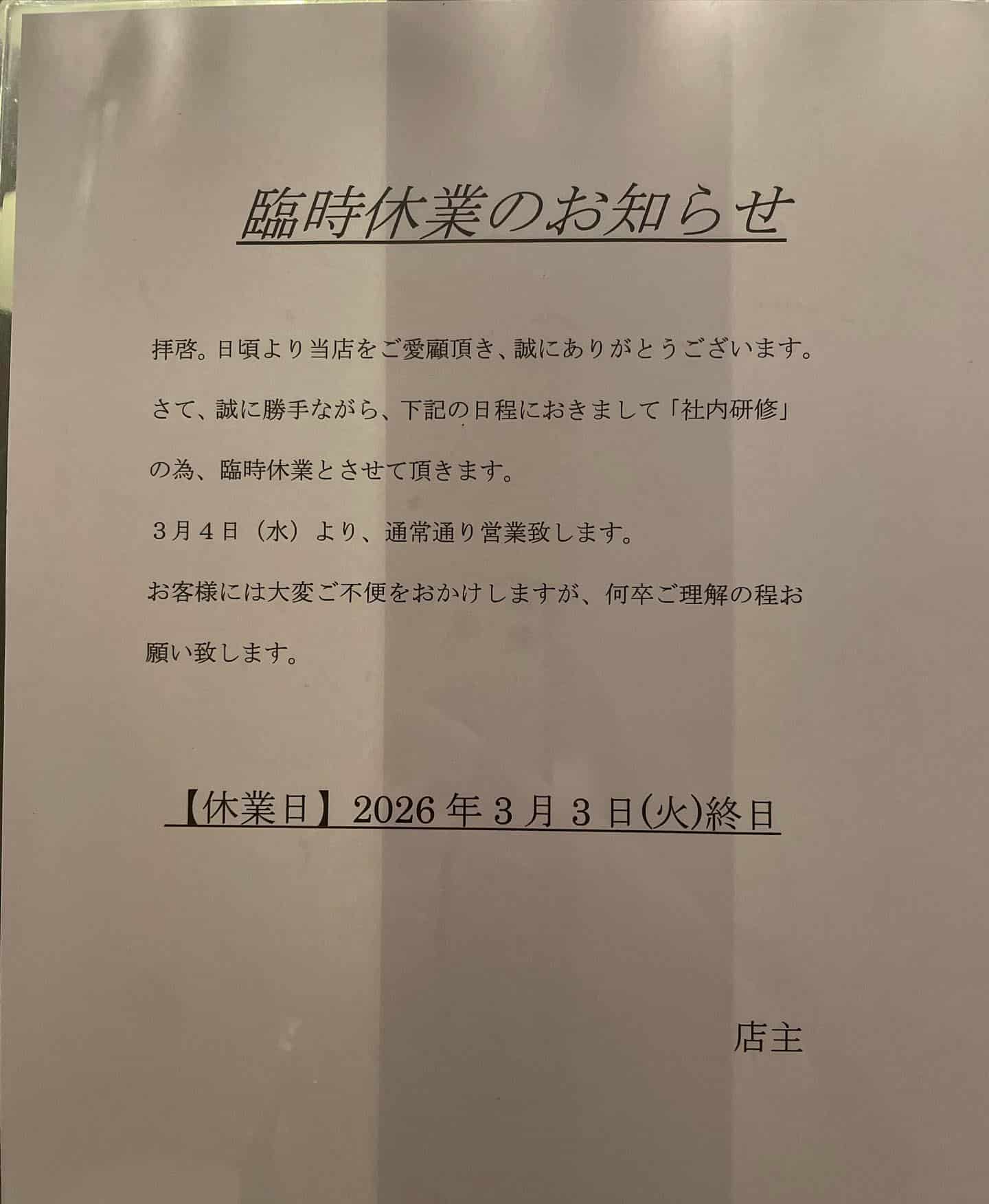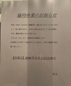 誠に勝手ながら下記の日程におきまして「社内研修」の為、臨時休業とさせていただきます。
